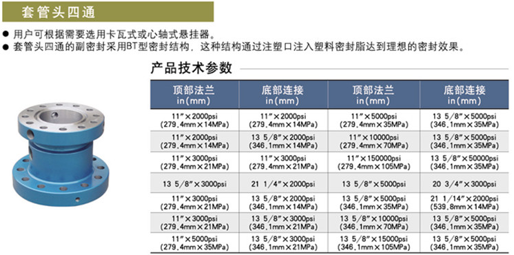 套管头型号:T9-5/8″×5-1/2″-5000Psi(35MPa)套管头。