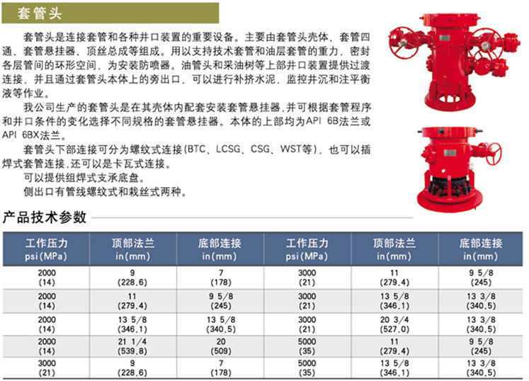 套管头是连接套管和各种井口装置的一种部件。用以支持技术套管和油层套管的重力,密封各层套管间的环形空间,为安装防喷器、油管头和采油树等上部井口装置提供过渡连接、通过套管头本体上的两个侧口,可以进行补挤水泥,监控井压和注平衡液等作业。
