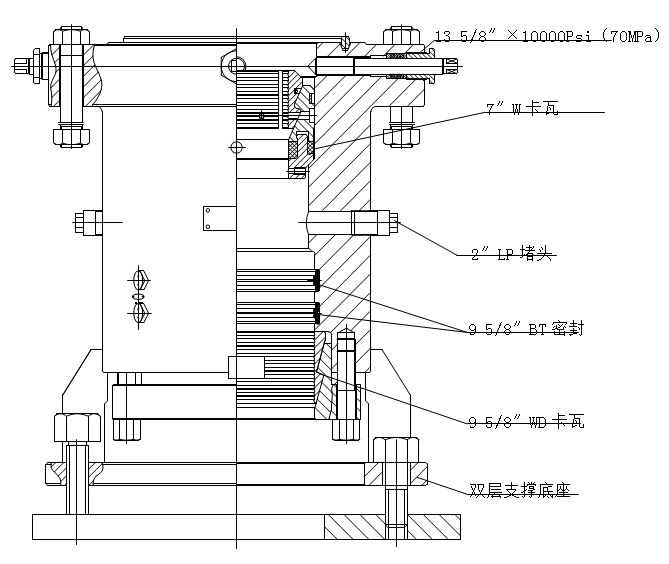 套管头下部采用9-5/8″WD型卡瓦悬挂,并配有双BT注脂密封,在BT密封间设计有用于密封测试的试压孔,并用单流阀堵住,注脂、试压单流阀出口连接螺纹为1″-14UNS公扣。